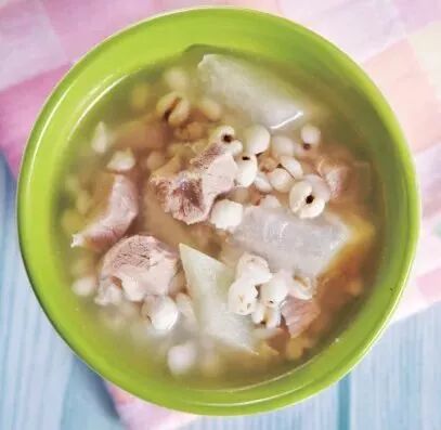 配料:瘦猪肉300 克、冬瓜500 克、薏米100 克、姜10 克、盐3 克、葱花适量